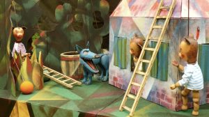 Az előadásban a klasszikus mese jelenik meg, drótos marionett bábok játékának segítségével, üde zenei kísérettel. A három malackának ezúttal is sok gondja akad a farkassal, de a végén felépül az a ház, amely menedéket nyújt mindhármuknak.
