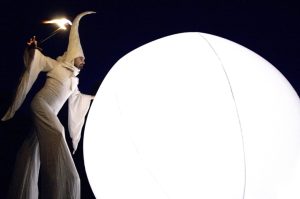 A bolgár gólyalábas csapat a Csepűrágó Fesztivál záróelőadásában zenélő óriáslabdákkal búcsúznak el Győrtől.